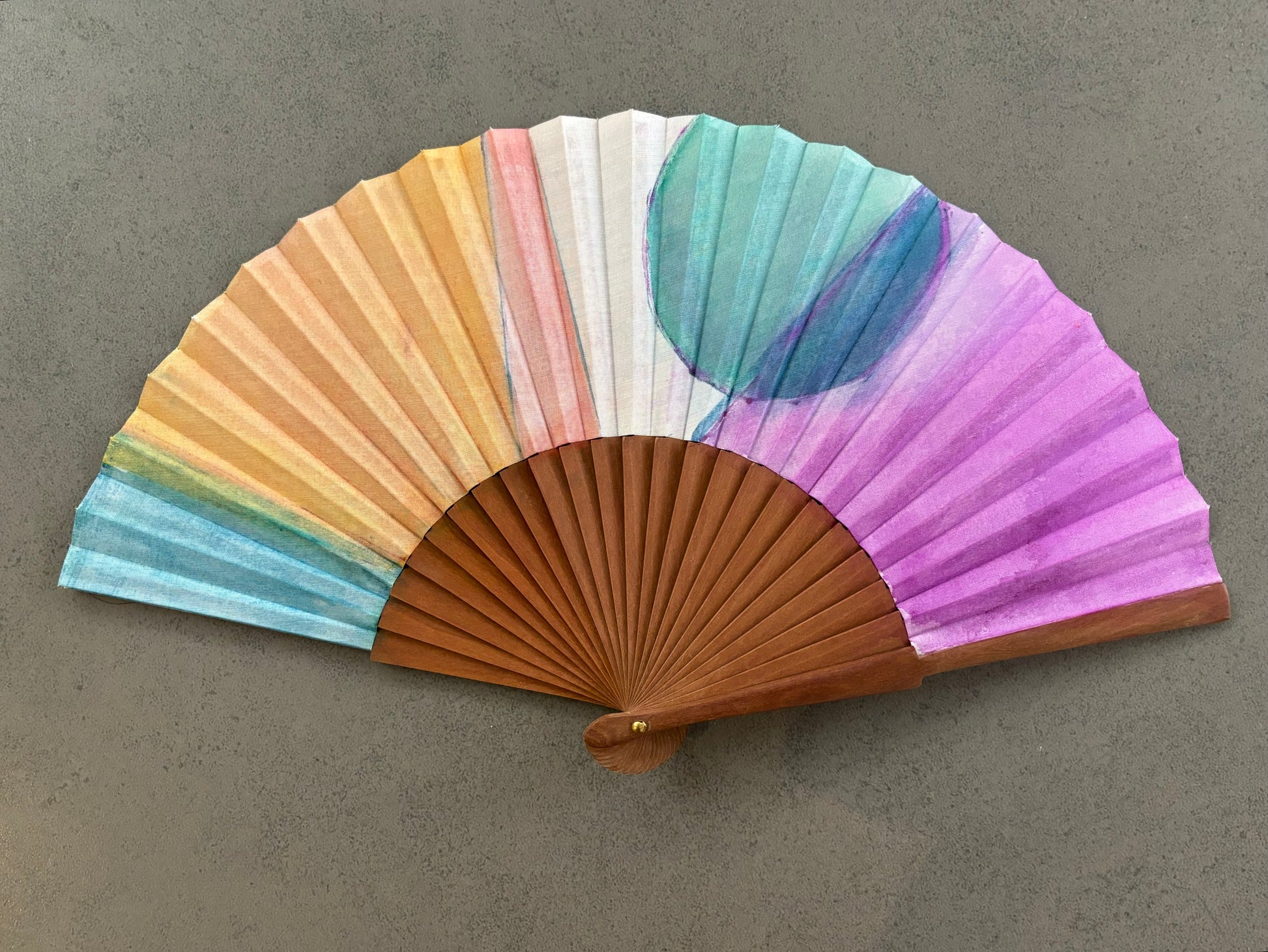 Abanico de tela y peral, pintado con acuarela.