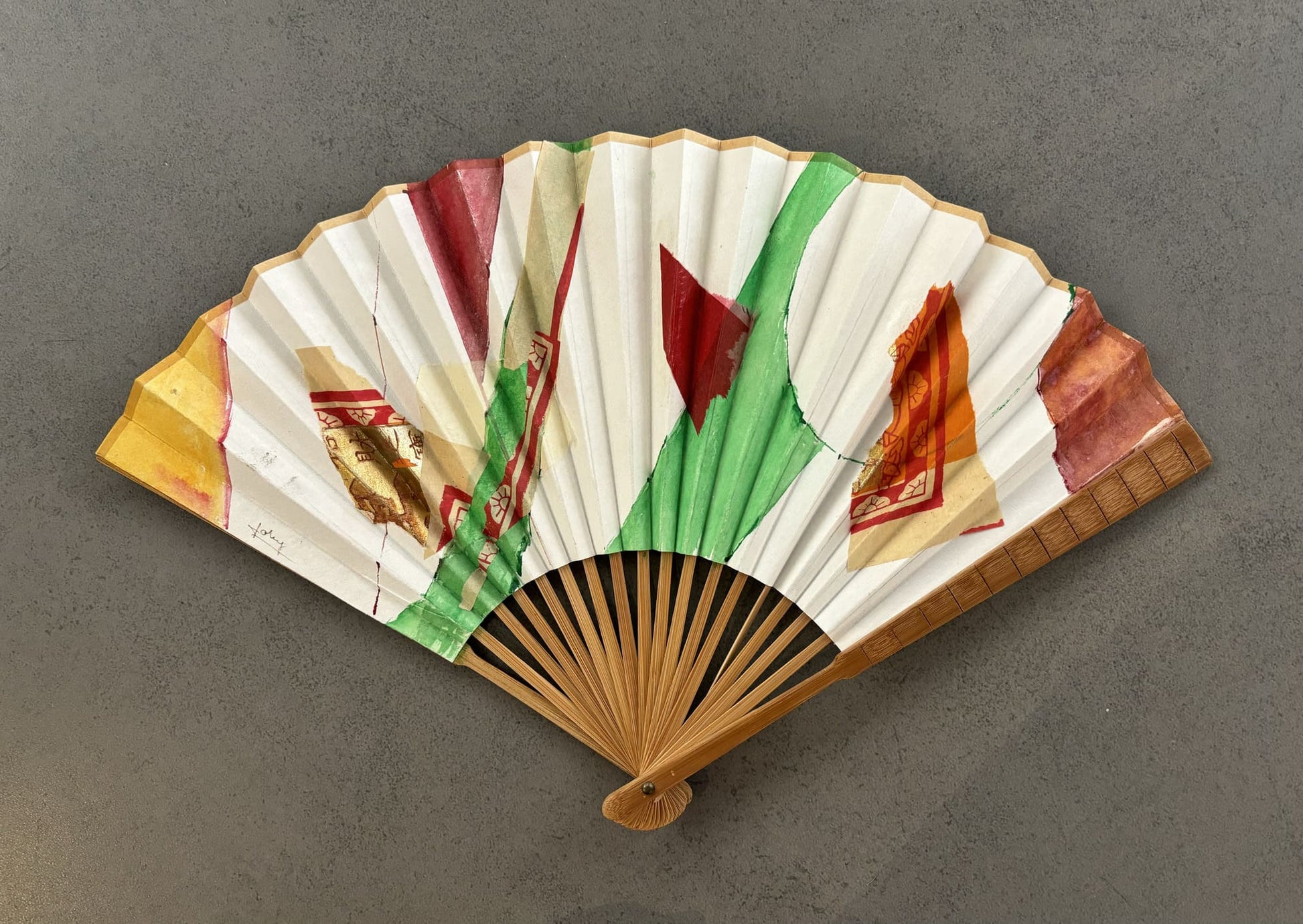 Abanico de papel y bambú, pintado con acuarela y collage.