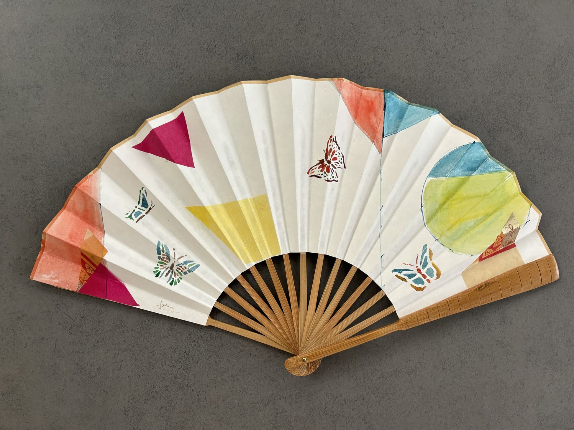 Abanico de papel y bambú, pintado con acuarela y collage.