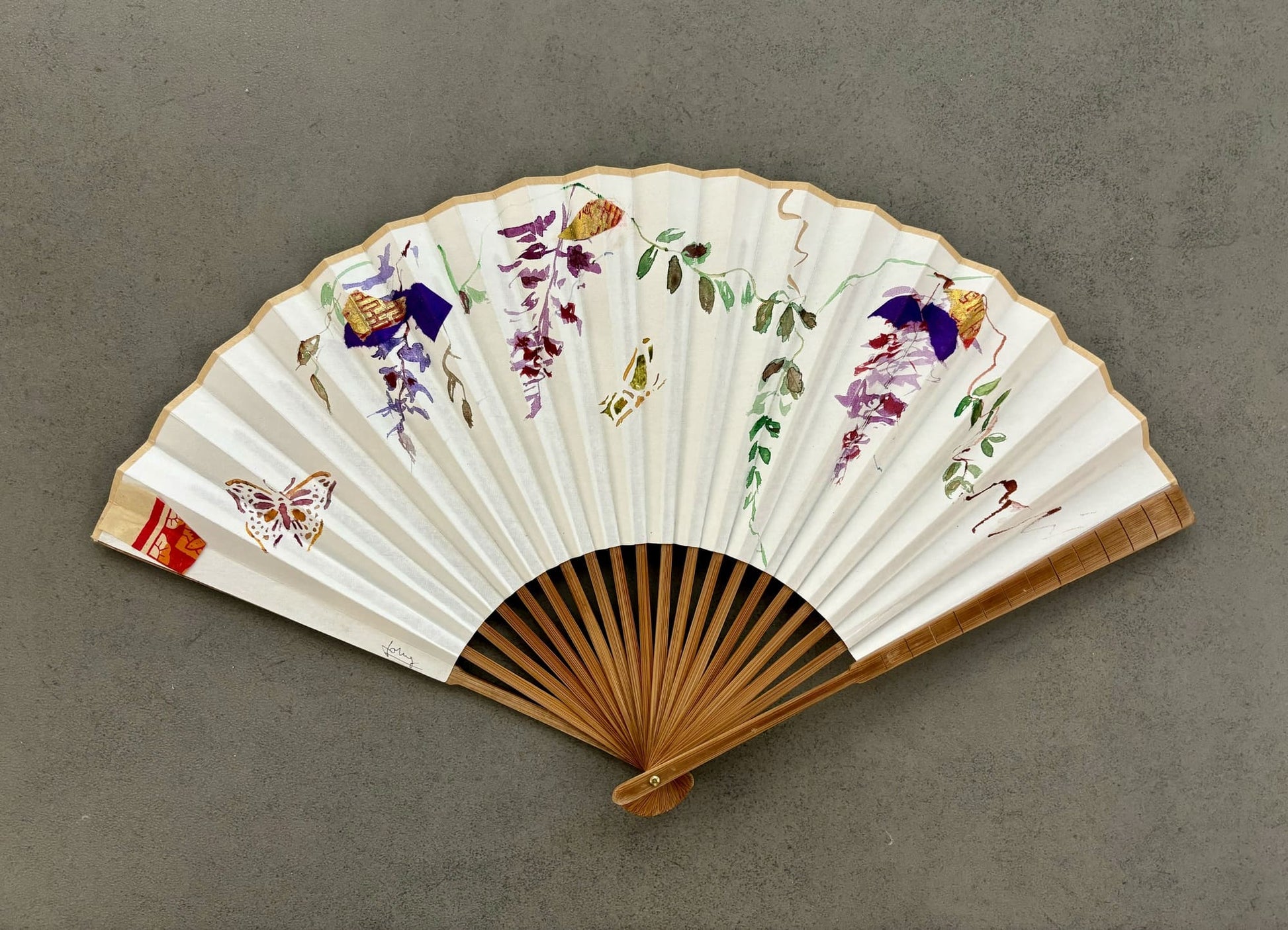 Abanicos de papel y bambú, pintado con acuarela y collage.