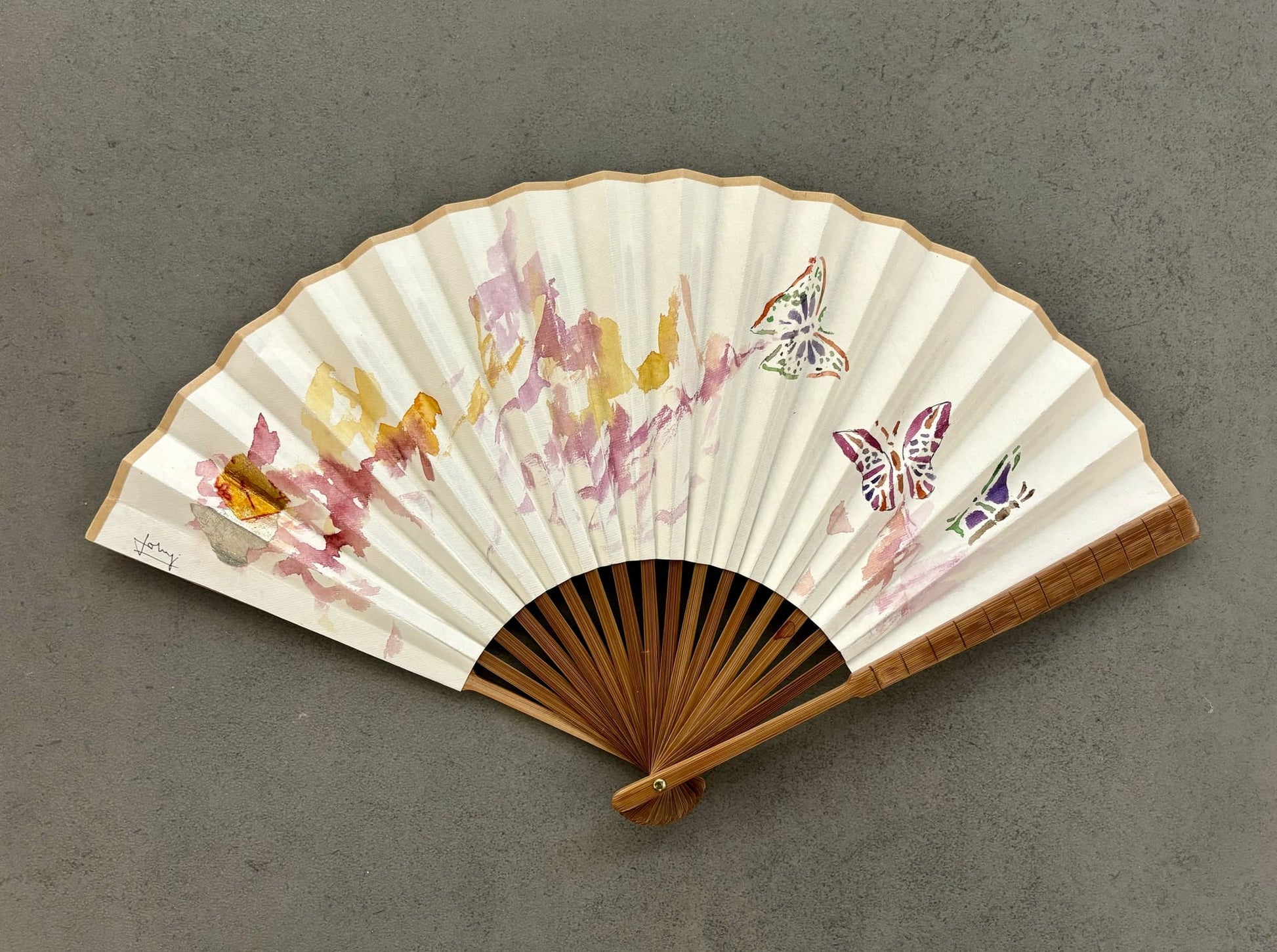 Abanico de papel y bambú, pintado con acuarela y collage.